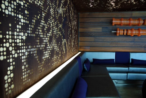 Wall panels and upholstered benches by AWM Group LLC at the Billiard Nook at the W Hotel